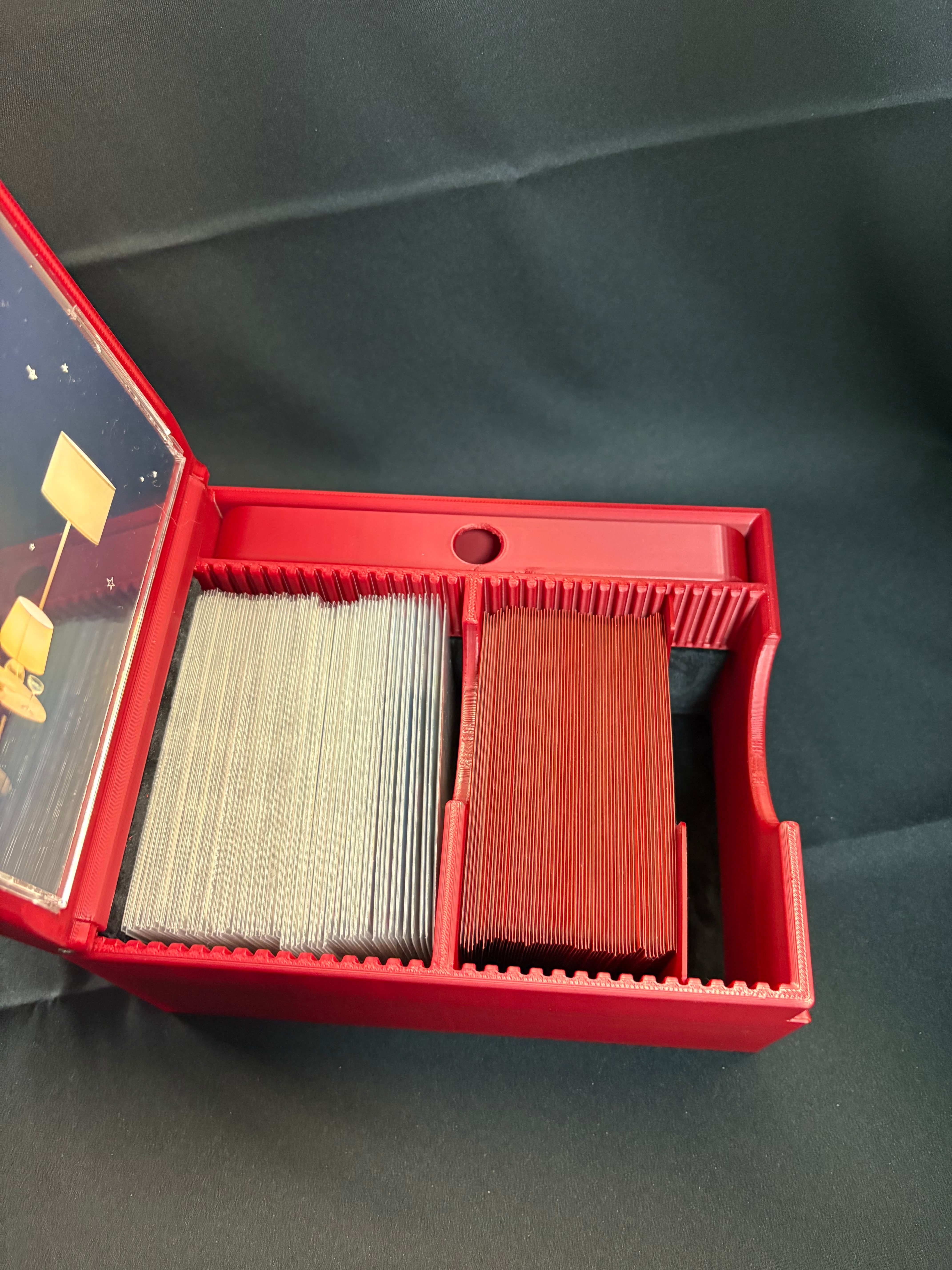 レギュラーサイズ(88mm×63mm)のカードに3重スリーブの60枚デッキを2つ収納が余裕です。(写真は3重スリーブデッキ60枚と2重スリーブ60枚です)
